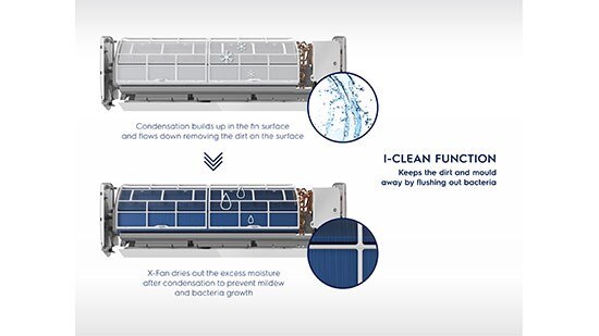 Đừng lo lắng về bụi bẩn và nấm mốc khi máy điều hòa không hoạt động. Công nghệ I- Clean có khả năng loại bỏ vi khuẩn, ngăn chặn sự phát triển của nấm mốc. Điều này có nghĩa, bạn sẽ không cần tốn nhiều công sức khi dọn dẹp nhà cửa.